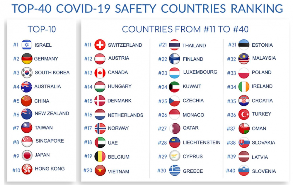 Par drošākajām valstīm koronavīrusa pandēmijā atzīta Izraēla, Vācija un Dienvidkoreja, savukārt 31.vietā ierindojusies Igaunijā, bet Latvija atrodas 39.vietā.