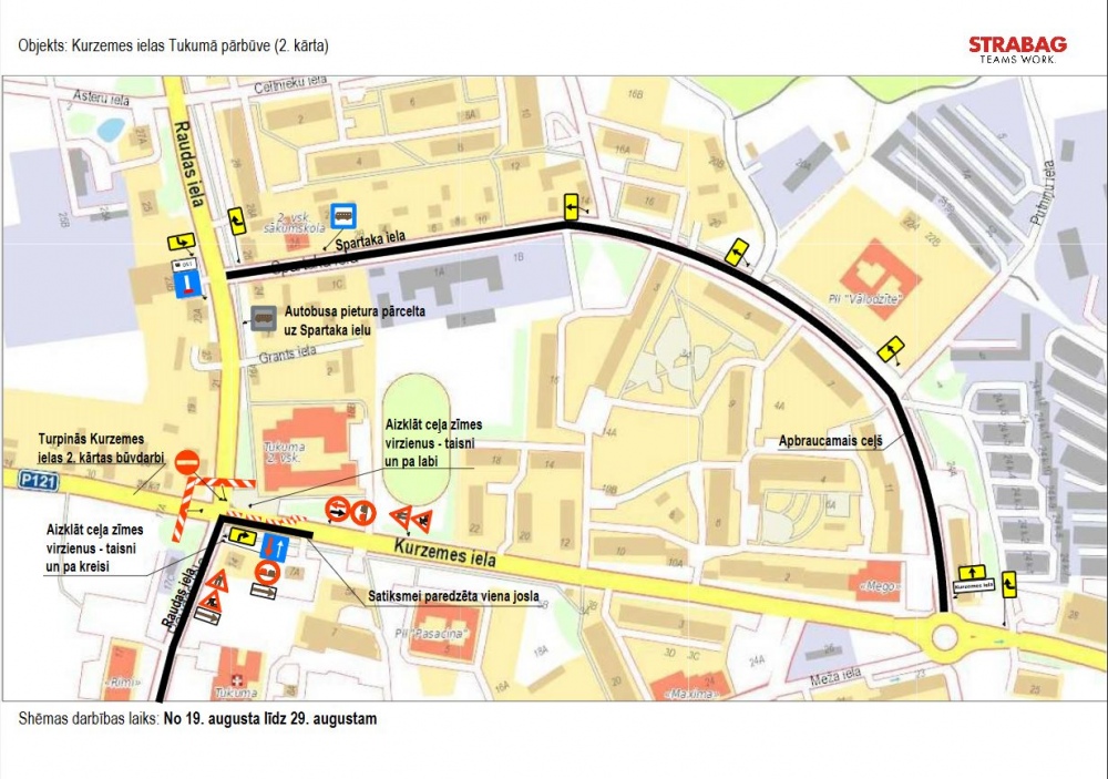 Sakarā ar siltumtrases izbūves darbiem, no 19. līdz 29. augustam Tukumā tiks daļēji slēgta satiksme autotransportam Raudas ielas un Kurzemes ielas krustojumā.